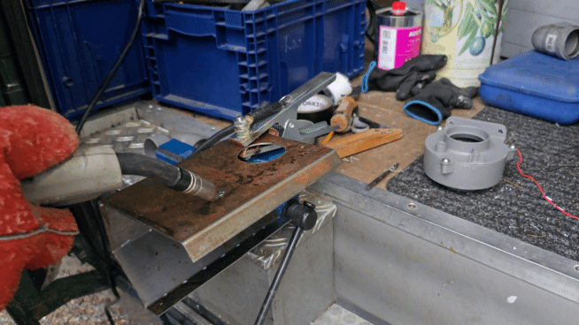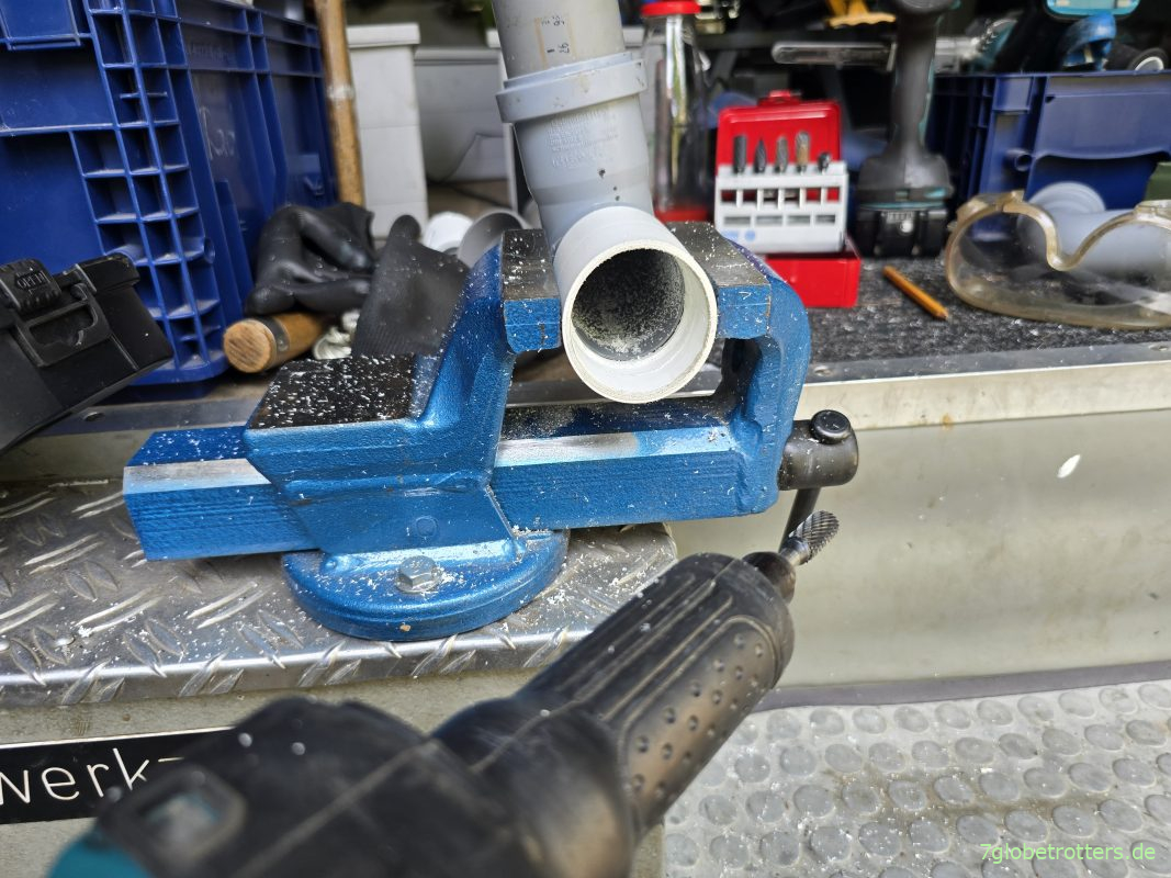 Die Verrohrung der Entlüftung ist dann noch ein bisschen Bastelei, weil ich immer noch keinen 3D-Drucker habe und die Standardware im Baumarkt doch zu wünschen übrig lässt. Muss also für die Verklebung von HT-Rohren Stoß auf Stoß ein Hüllrohr anpassen. Da sieht man mal, wie praktisch so ein Busschraubstock ist.