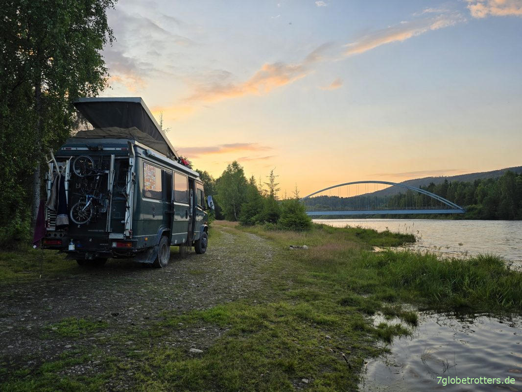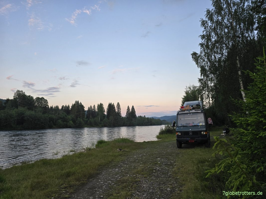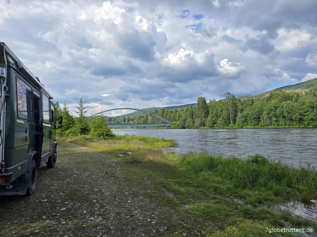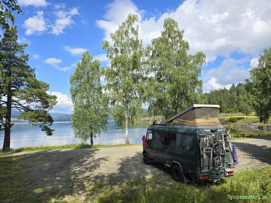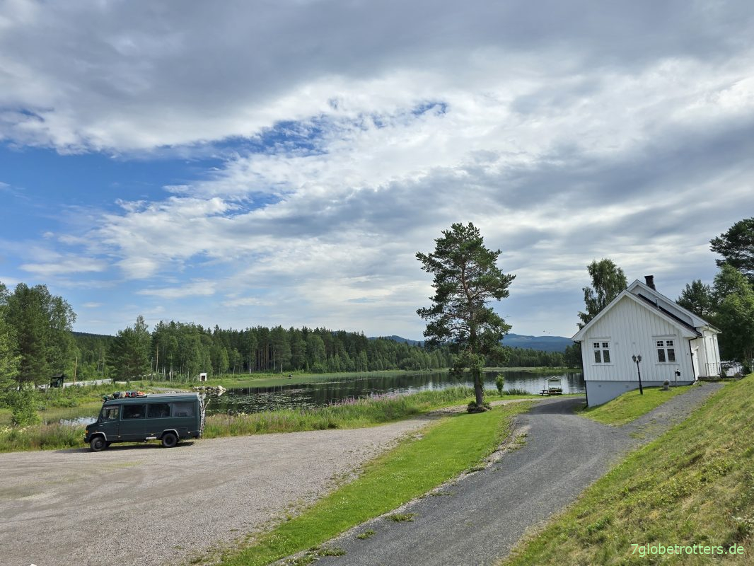 Die Züge hinter dem Stellplatz am Mjøsa-See waren doch nicht so nervig wie gedacht. Und auch vom gestern angekündigten Hochwasser im Gudbrandstal ist weit und breit nichts zu sehen. Sind alle richtig enttäuscht darüber.