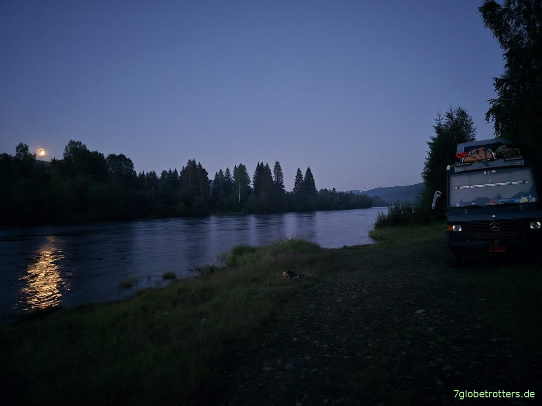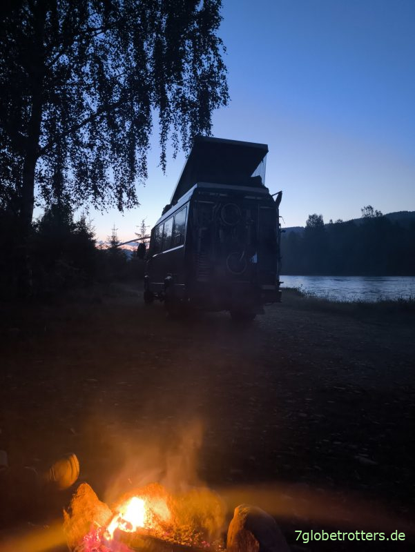 19:30 Uhr gibt es noch ein Flussbad und dann erst Abendbrot, vor allem aber endlich wieder einmal ein schönes Lagerfeuer mit Würstchen und hartem Norwegerbrot.