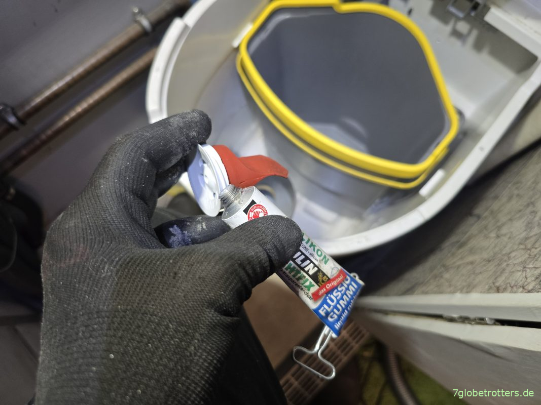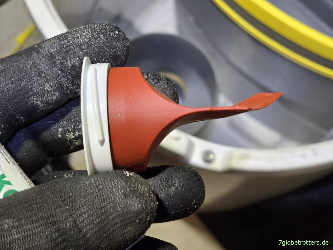 Ansonsten muss ich für den Einbau nichts zerlegen, sondern klebe die Membran mit meinem urinbewährten Silikondichtmittel Bindulin Dichtfix nur von oben in mein 40er Urinrohr. Das war’s schon. Am längsten bei der Montage des Membran-Geruchsverschlusses hat gedauert, auf diese Lösung zu kommen.