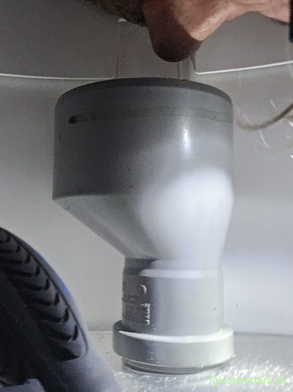 Direkt nach der Montage des trockenen Geruchsverschlusses mache ich den ersten Test und leere den Urintank vollständig. Und während der obere Ausgang der Urinableitung nach der Tankentleerung sonst wie verrückt nach Ammoniak oder sowas gestunken hat, kann ich jetzt meine Nase direkt drüber halten und es ist nichts zu riechen. Absolut perfekt.