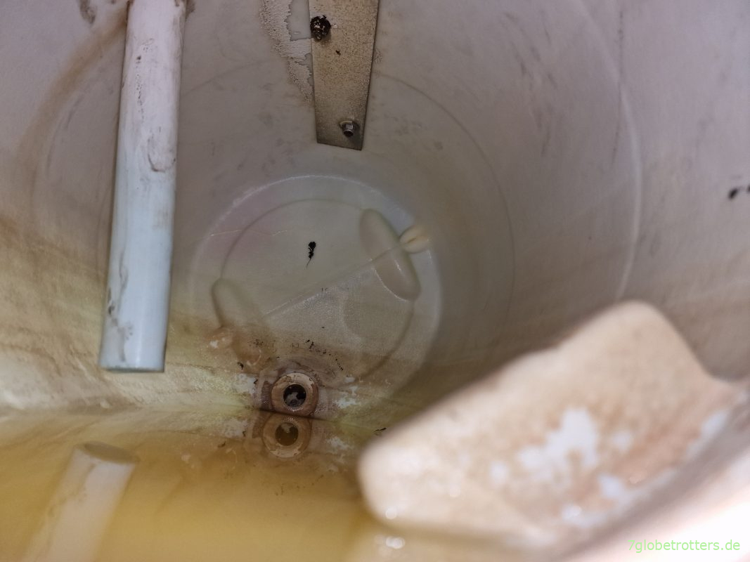 Insofern funktioniert mein hydraulischer Geruchsverschluss im Prinzip hervorragend. Die Urinleitung geht nämlich direkt bis auf den Boden des Urintanks und wird so vom Urin selbst abgesperrt. Ganz unten, am Grund der Leitung steht zwar ein bisschen Urin, aber der ist immer recht frisch und hat gar keine Gelegenheit, groß Gerüche zu entwickeln.