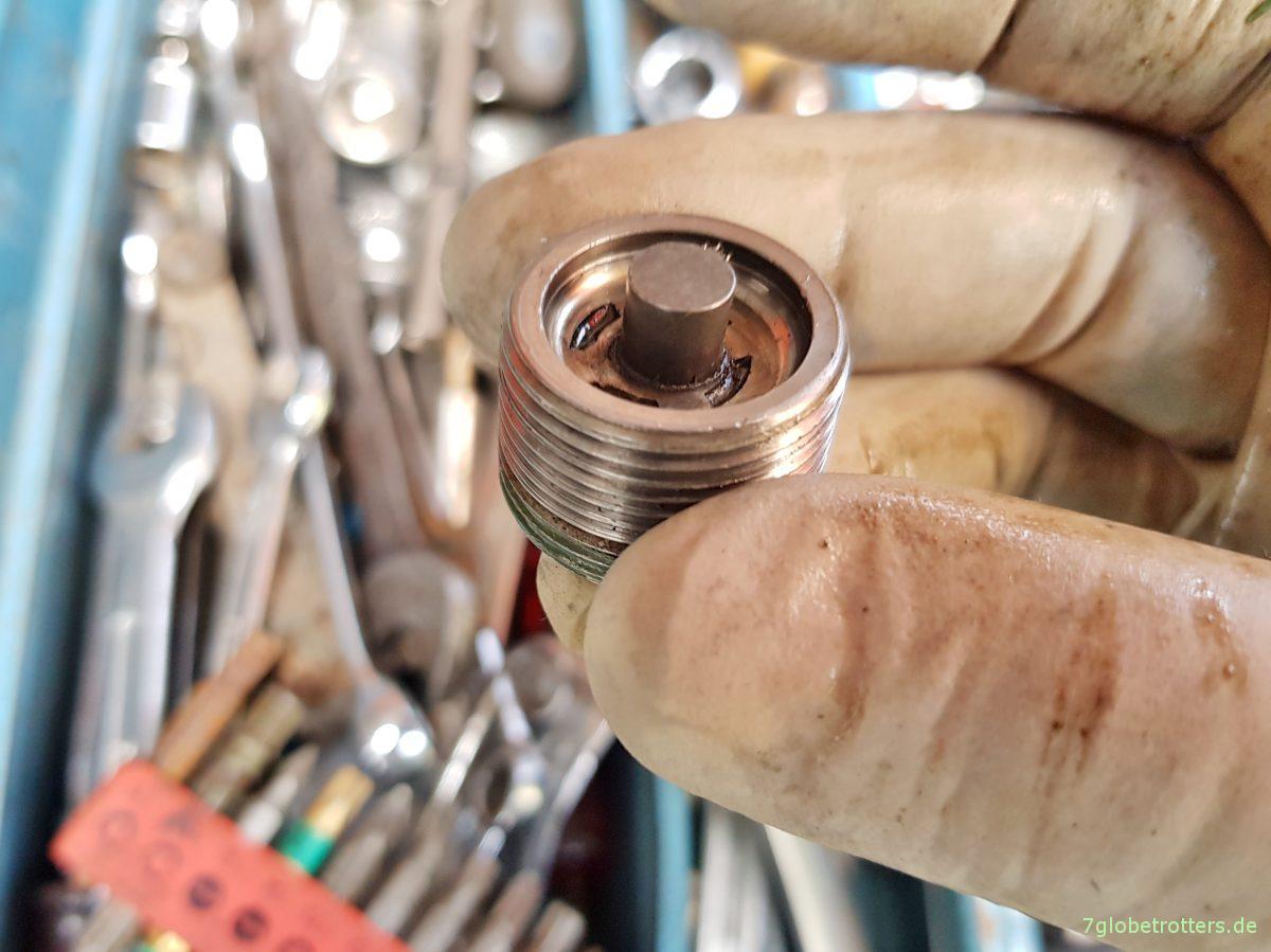 Die magnetische Ablassschraube und das beim Getriebeöl wechseln abgelassene Getriebeöl nach Auffälligkeiten untersuchen. Späne oder gar Brocken sind gar nicht gut. Das hier ist nur ein bisschen Abrieb.