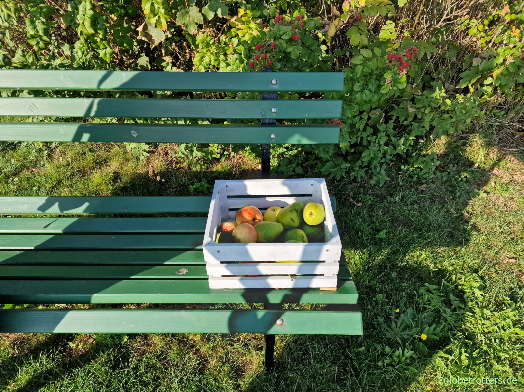 In Liebstein reicht eine Frau eine Birne und einen Apfel über den Zaun. 500 m weiter steht eine Bank mit Sonnenschirm und einem ganzen Korb mit Äpfeln und Birnen. Hier im tiefen Osten ist die Welt noch in Ordnung.