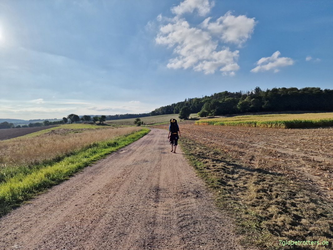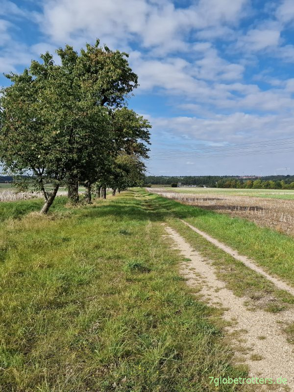 14:30 Uhr sind wir raus aus der Stadt und ich hab mittlerweile auch keine Befürchtungen mehr, dass wir immer nur auf rollatorgerechten Wegen inmitten von Pilgerscharen unterwegs sind. Es geht zwar anfangs an einer großen Straße lang, aber dann beginnt ein netter, einsamer Feldweg quer übers Land. So könnte es weitergehen.