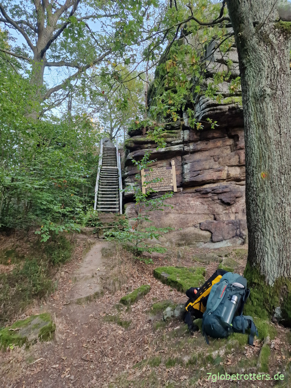 Na gut, dann eben nicht. Es ist zwar jetzt schon 17:45 Uhr, aber ein bisschen Zeit haben wir noch bis zur Dunkelheit. Können also erst mal noch auf den 373 m hohen Totenstein klettern, einen schönen Granitfelsen mit Wollsackverwitterung. Hier hat man schon in der Bronzezeit Partys gefeiert. Man merkt schon, kaum sind wir weg vom Jakobsweg, werde ich rückfällig und schalte den Kopf wieder ein.