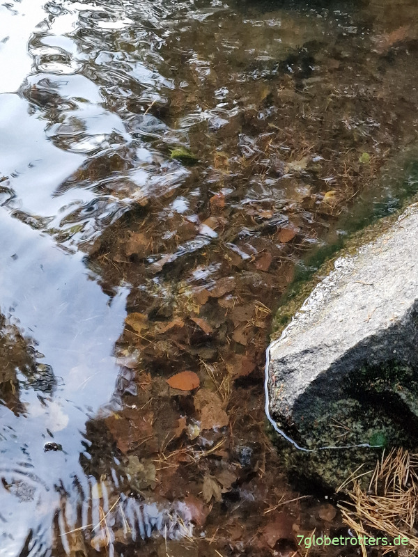 Jetzt kommt das Beste nach der Wanderung über den staubigen Jakobsweg: Das Bad. Obwohl der Zugang über die glitschigen, scharfkantigen Steine doof und das Wasser kalt ist, begeistert die Erfrischung. Tja, das kann keine Pfarrei bieten.