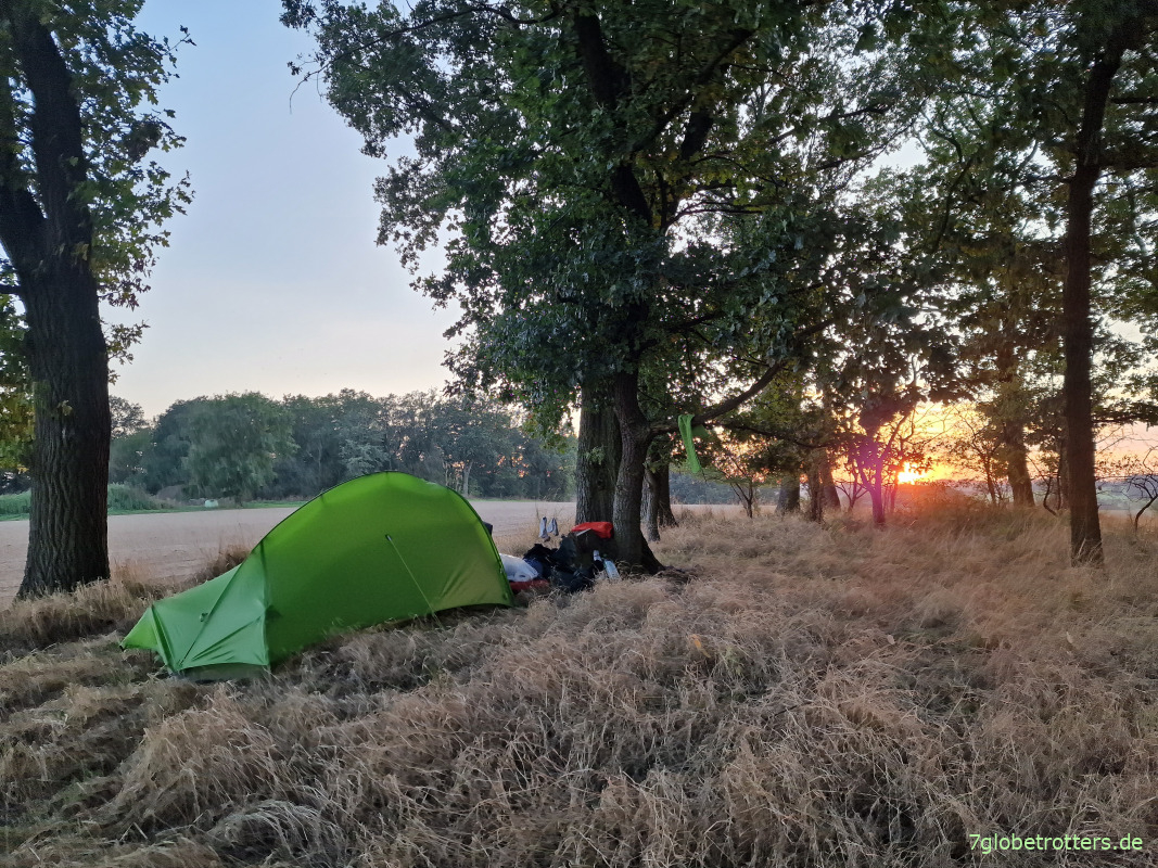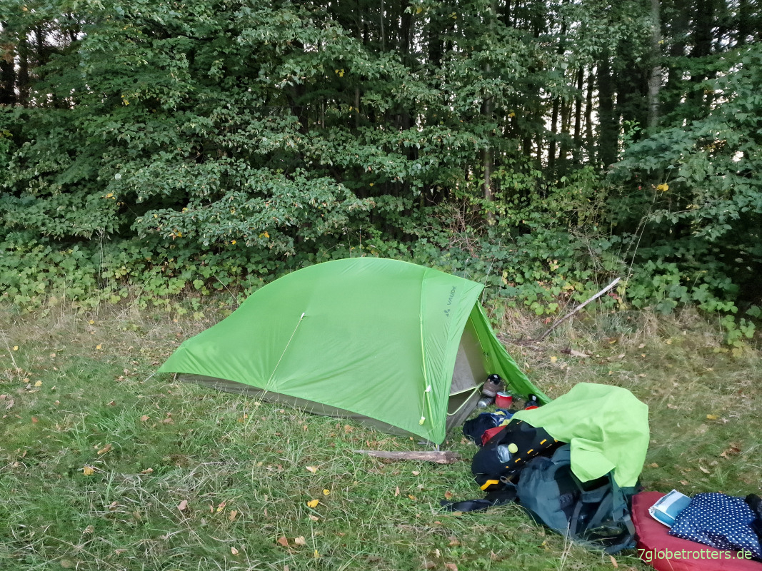 Die Nacht nach der gestrigen Wanderung auf dem Jakobsweg von Arnsdorf hierher war ruhig. Keine Wildschweine, keine Wölfe, keine Schweden. Nur das lange Schlafen macht mich fix und fertig. Mein kleinstes und leichtestes Ultraleichtzelt ist zwar süß und auf den Luftmatten auch bequem, aber so früh um 4 Uhr bin ich wach. Und dann erdrückt mich die Enge im Vaude Hogan fast. Kann mich ja nicht groß bewegen, um niemanden aufzuwecken.