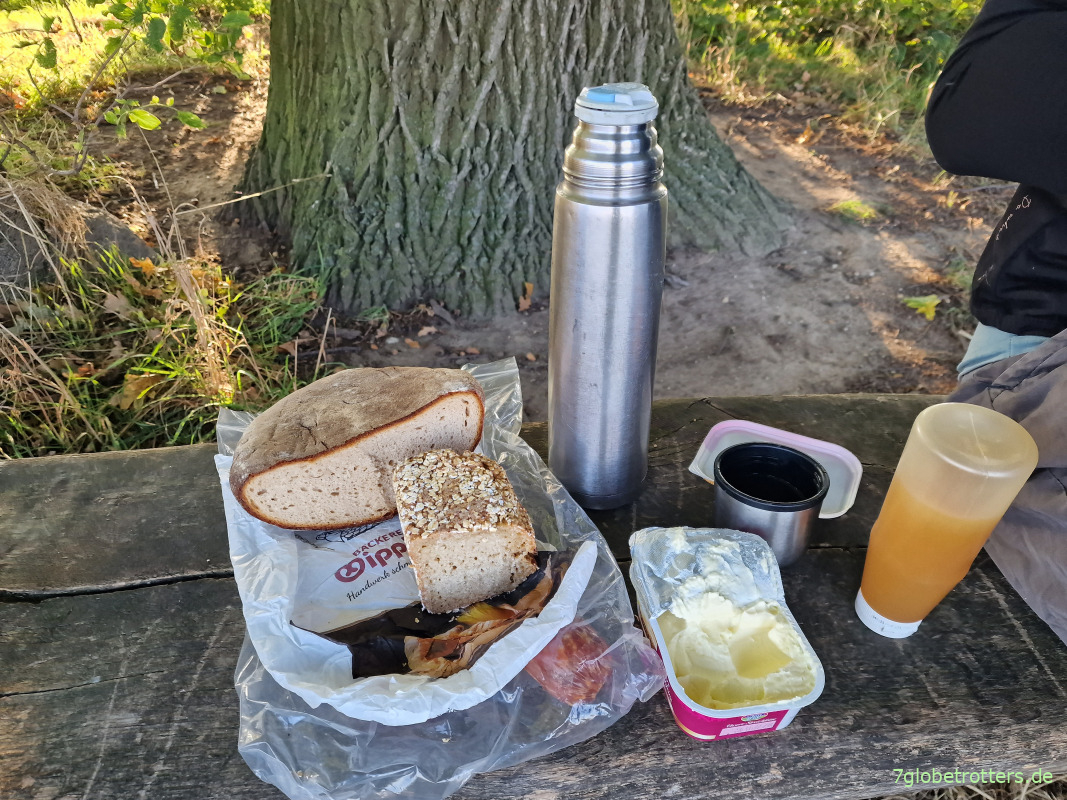 Jetzt erst wird der Tee ausgeschenkt. Die fette Thermoskanne widerspricht zwar allen meinen Regeln für die ultraleichte Trekkingausrüstung und ich würde die auf Solotour auch niemals mitnehmen, aber die ist schon praktisch. Dazu gibt es Honigbrote und Äpfel. Alles andere ist nun wirklich überflüssig.