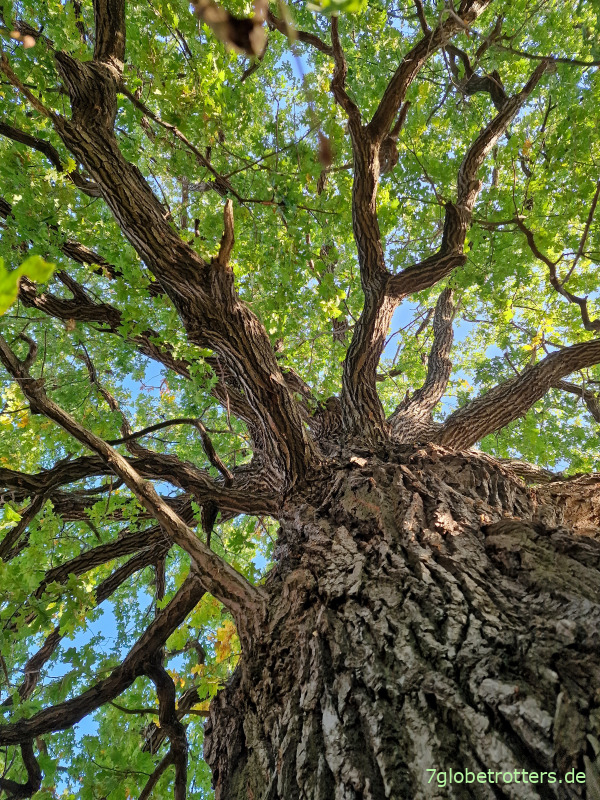 Erstes Jakobswegziel ist eine Bank in der Sonne. Die brennt aber schon bald so stark, dass wir umschwenken auf eine Bank im Schatten. Die finden wir 08:15 Uhr kurz vor Drehsa unter einer riesigen, freistehenden, wirklich beeindruckenden Eiche mit dicken Ästen. Was für ein Baum!