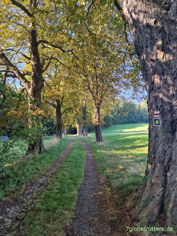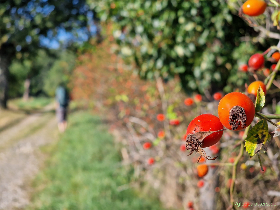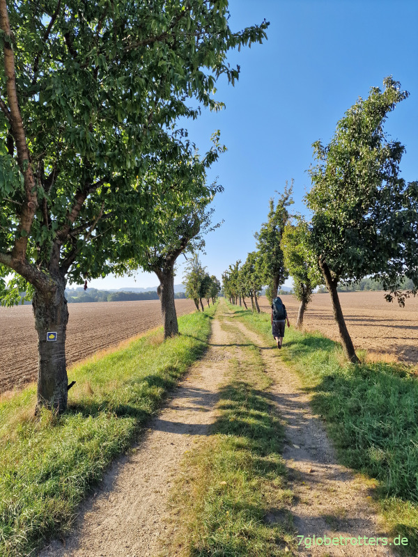 Es ist aber auch traumhaft hier auf dem Jakobsweg. Einerseits der uralte Obstbestand rechts und links des Feldwegs, andererseits aber auch schon die ersten Zeichen des Herbstes. Dazu blauer Himmel, warme Sonne und keine Leute. Eine wunderbare Septemberwanderung.