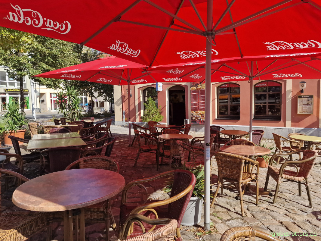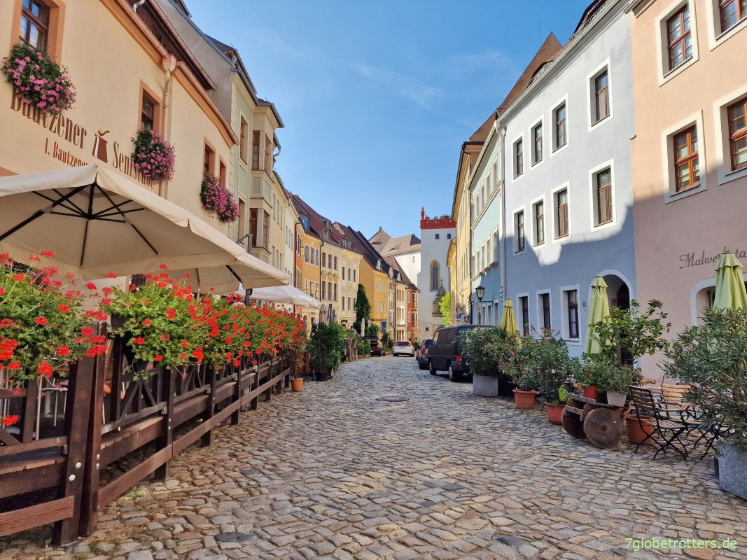 Aha, hier hinter dem Dom hat sich die Bautzner Gastronomie versteckt. Die Altstadt von Bautzen zwischen Kornmarkt und Spree liegt zwar nicht direkt auf dem Jakobsweg, ist aber dafür sehr sehenswert. Zahlreiche Kneipen mit Tischen auf der Straße, viel Laufkundschaft, schönes Wetter. Alles supi. Diese inoffizielle Variante vom Jakobsweg hab ich doch gut organisiert. Schulterklopf.
