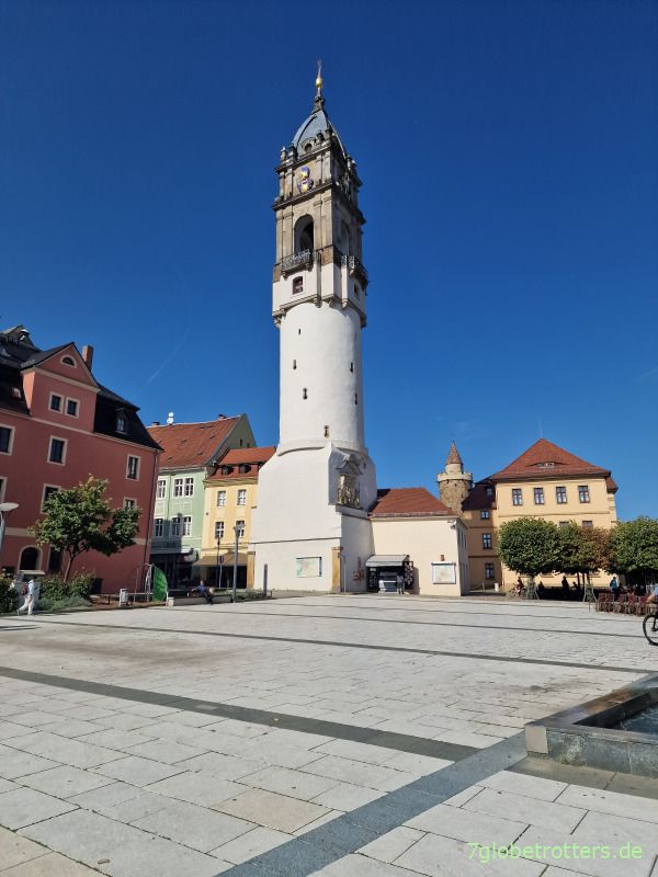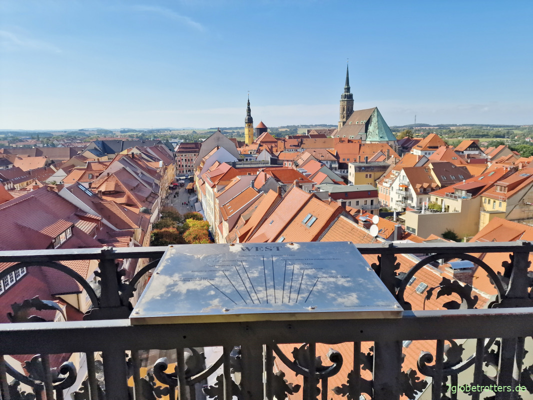 14:00 Uhr rüber auf den Kornmarkt und hoch auf den schiefen Reichenturm. 118 Stufen, 56 m hoch, 1,44 m aus der Geraden. Der schiefe Turm von Bautzen.