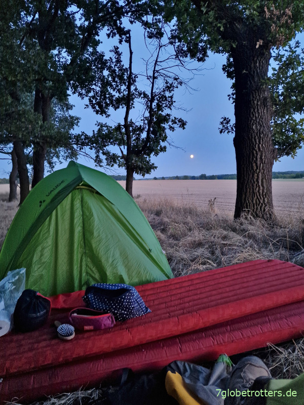 Dann sitzen wir noch ein bisschen draußen und rätseln, wann der pflügende Trecker im Süden die Arbeit einstellt. Als er beim Sternenaufgang davonfährt, duschen wir mit je 50 ml Wasser und gehen ins Zelt. Der Mond leuchtet rein, als ob der Förster mit der Taschenlampe neben uns steht.