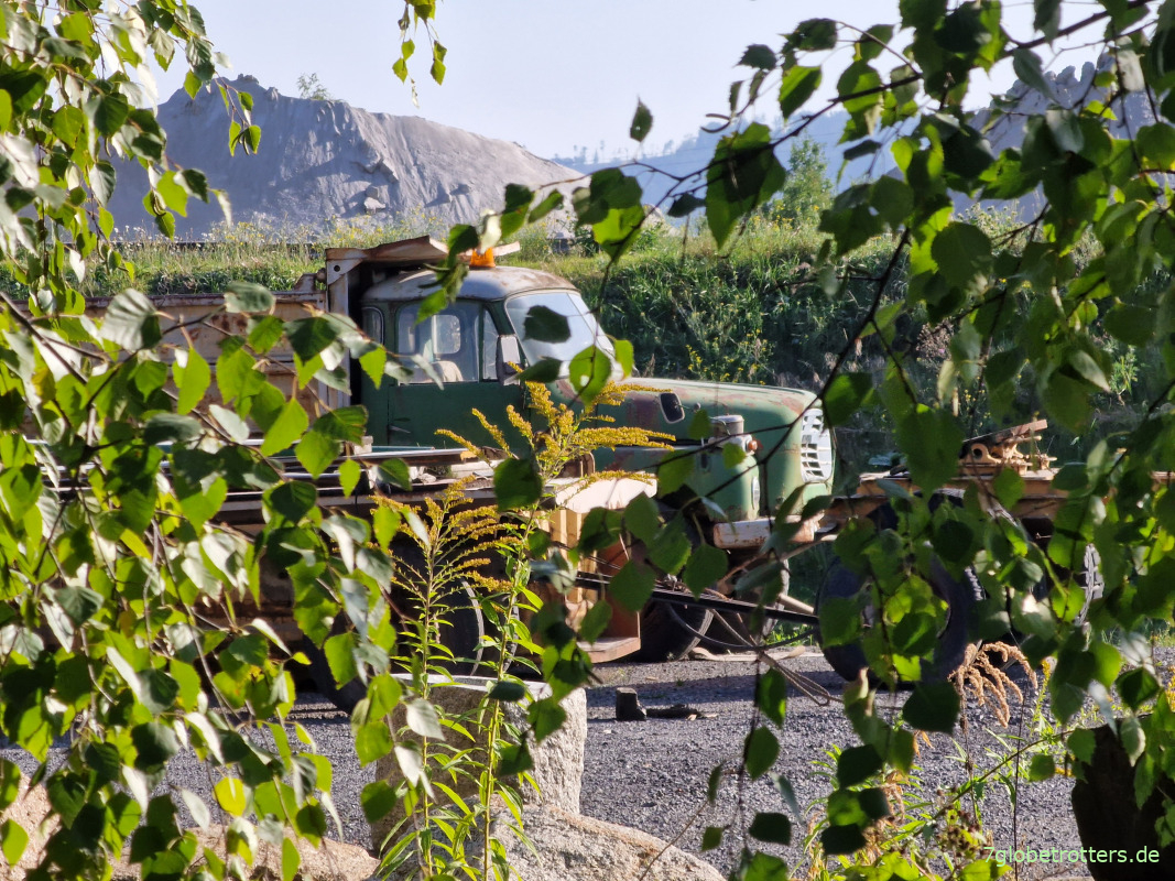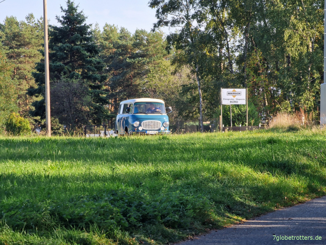 Einen Kilometer später Pause am Heldendenkmal Salzenforst. Und genau da kommt ein hübscher Barkas angepleppert. Sehr schick. Und aufgrund der Farbe findet der Barkas sogar Gefallen aller Pilger. Hat eben auch Vorteile, wenn man in der ostdeutschen Provinz an Straßen lang wandert.