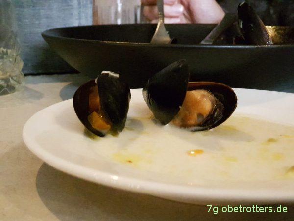 Essen gehen. Eine Hitze in Riga. Doch es gibt zum Glück klimatisierte Restaurants. Erholungspause also. Ja, die Muschelsuppe ist mit Muscheln.