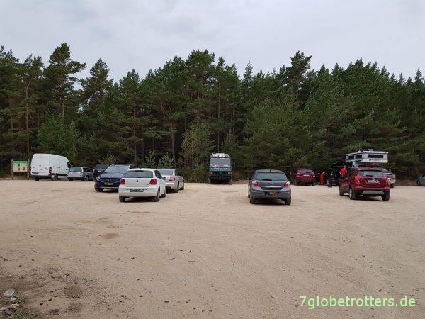 Ohne viel davon zu sehen, fahren wir am längsten Strand Europas entlang. Muss bei Jūrkalne mal nachschauen, ob der Strand überhaupt noch da ist. Ist sowieso gerade Mittagszeit. Und auf ein Restaurant muss man hier nicht hoffen. Gibt zwar ab und zu mal einen kleinen Imbiss, der Eis verkauft. Aber nichts Richtiges. Stehen also auf dem Parkplatz direkt an der berühmten Steilküste von Jūrkalne.