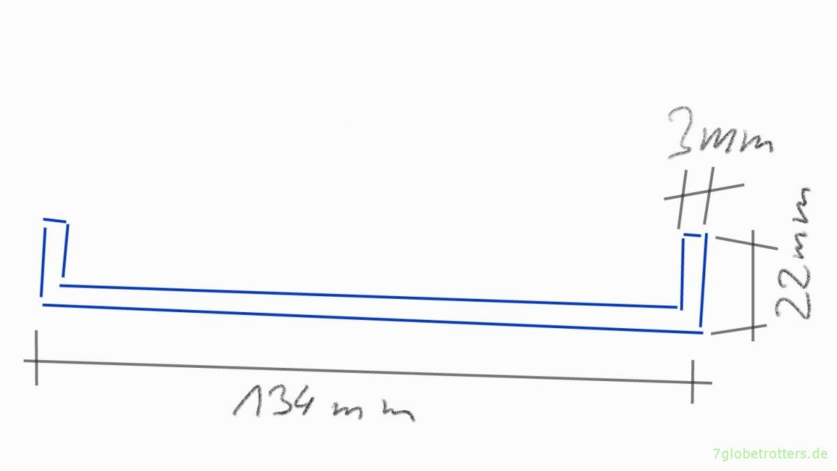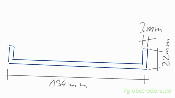 Hier ist noch eine Handykrakelzeichnung mit den Maßen des U-Profils aus Aluminium für die seitliche Halterung der Sitzbänke der Sitzgruppe. Es kommt da aber sicher nicht so genau auf die Maße an. Wichtig ist die Kantung und die Dicke für die Stabilität.