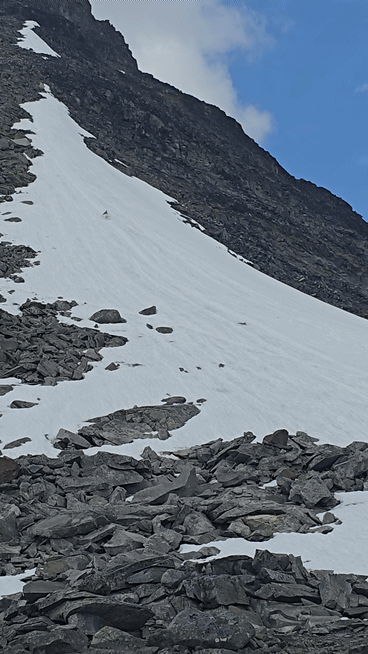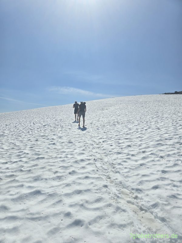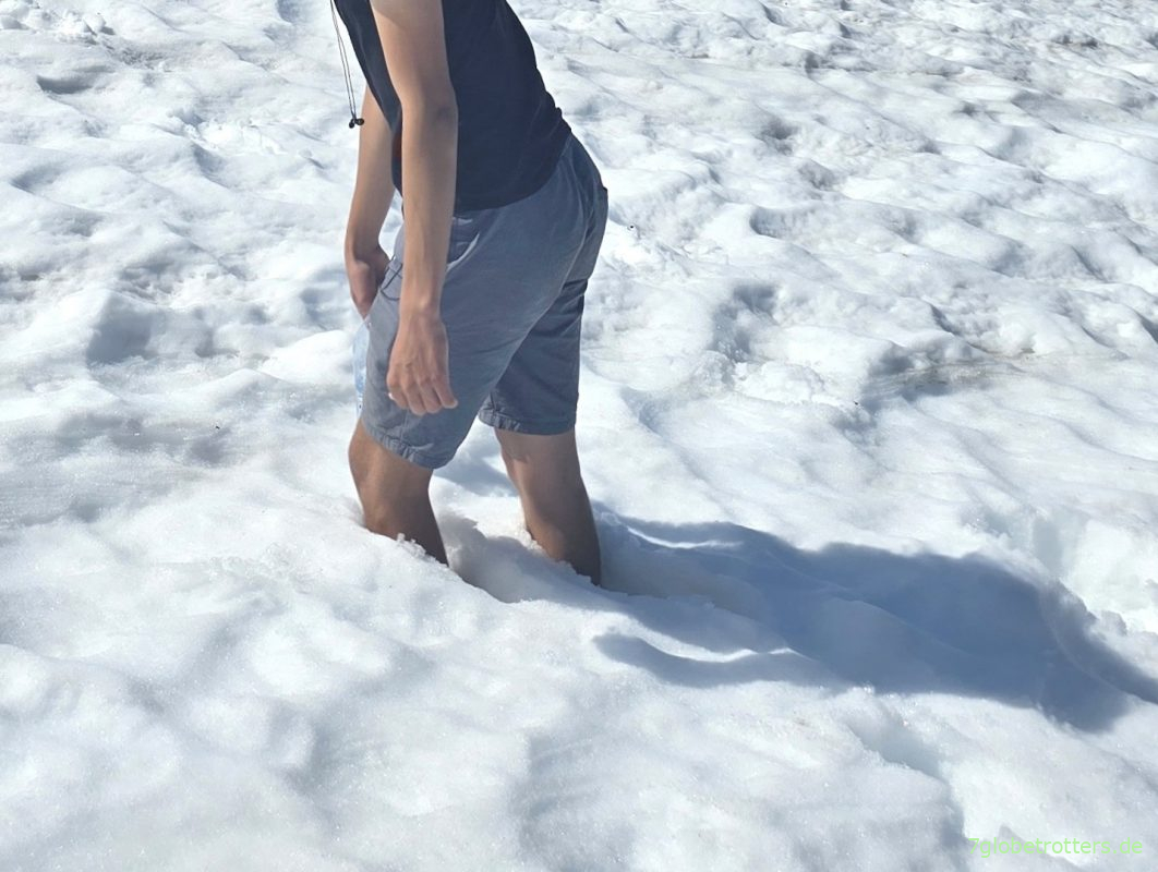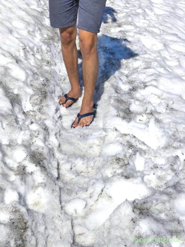 Allerdings zeigt sich, dass Schneefelder bei der Hitze durchaus anspruchsvoll sind. Denn bei einer kleinen Wegabweichung bricht der Jüngste ein. Für sich genommen ist das ja unproblematisch, aber beim Rausziehen zerreißt ein FlipFlop.