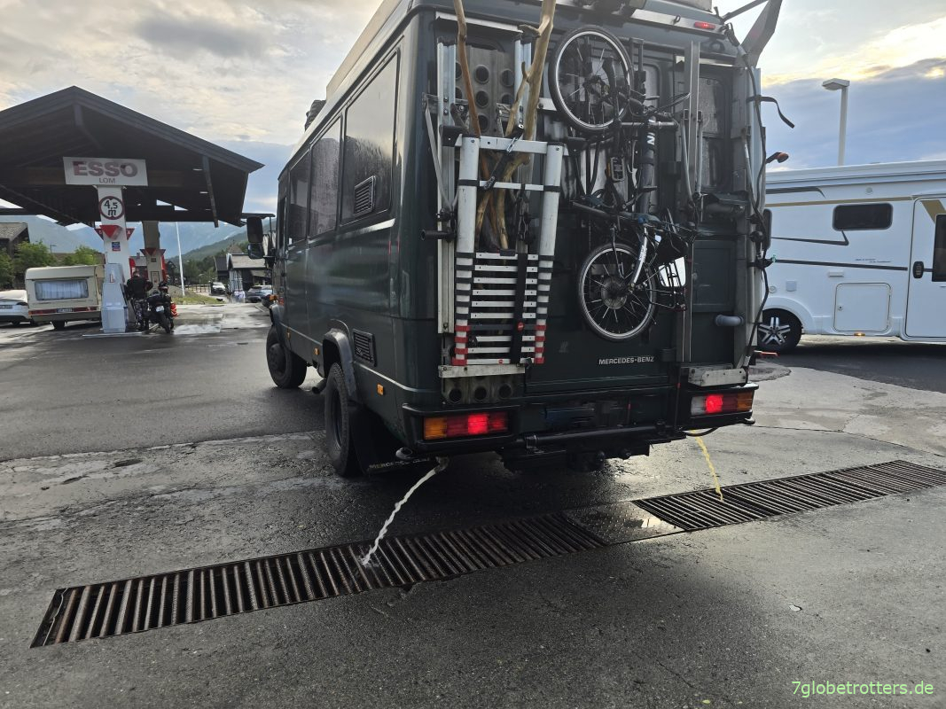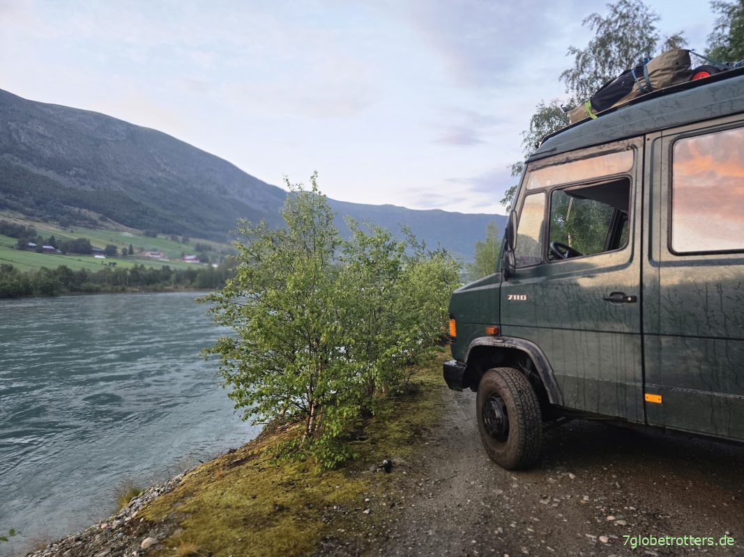 Rolle runter nach Lom, einem hübschen Städtchen mit Supermarkt, Stabkirche und Kreisverkehr. Sowie mit Abwasser– und Urinentsorgung. Diesen Komfort vermisse ich in Deutschland wirklich. Im Foto sieht man übrigens schön, wo ich immer die 11-sprossige Auszugsleiter verstaue, die ich fürs Dachgepäck brauche. Und dass links statt der Sandbleche diesmal die Fahrradträger Nummer 5 und 6 montiert sind. Denn ursprünglich gab es mal den Plan, nicht nur 2 Paddelboote, sondern zusätzlich alle Fahrräder auf dem Heckträger mitzunehmen.