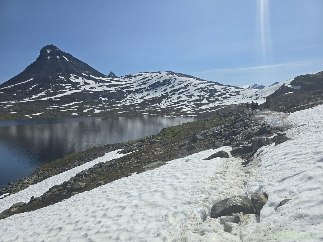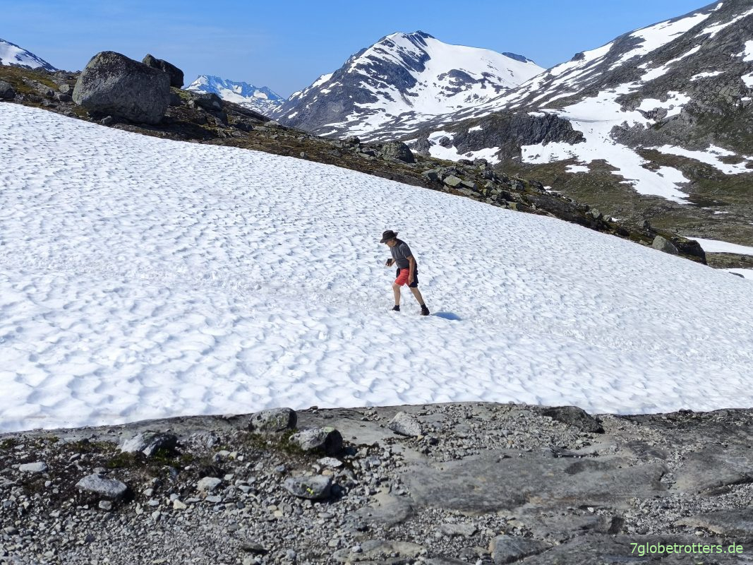 Wenigstens ich hab zumindest halbe Bergschuhe an, während mein Jüngster für die Besteigung der Kyrkja FlipFlops gewählt hat. Frag mich nur, was die Leute denken. Aber die Norweger sind da entspannt und amüsieren sich höchstens. Und um die Kälte mache ich mir auch keine Sorgen. Er war gestern im Gletschersee baden, da sind FlipFlops im Schnee doch Pillepalle.
