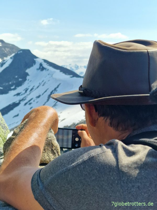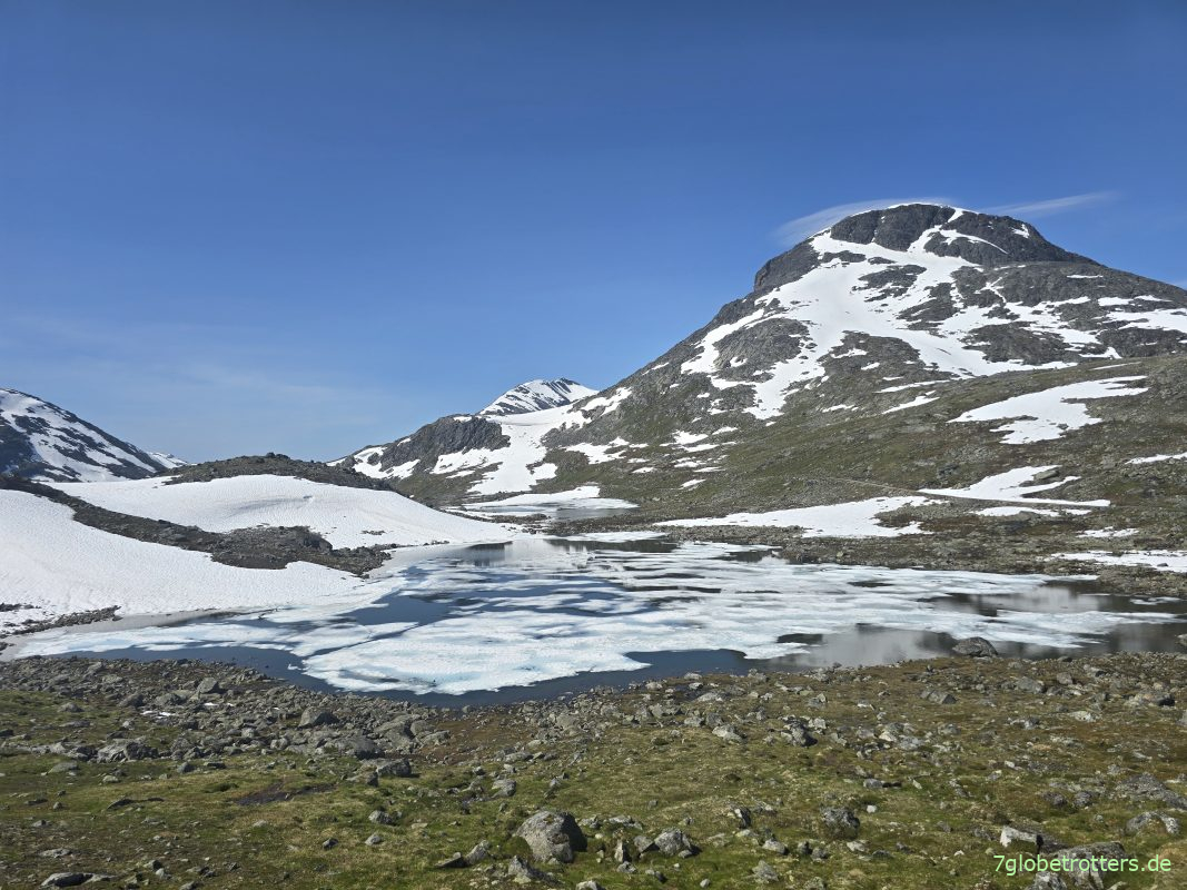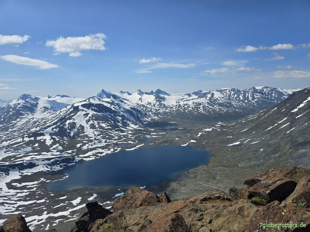 Sind genau 15:15 Uhr oben auf der Kyrkja. Der Aufstieg von der Leirvassbua hoch zur Kykja verlangte somit 3½ Stunden für 550 Höhenmeter und 4 km. Der Ausblick von der Kyrkja mit ihren 2032 m hat schon was. Hinter dem See ist die Leiradalstraße zu erkennen, wo der Bus steht. Den hundertfachen Handyzoom spare ich mir aber mal.