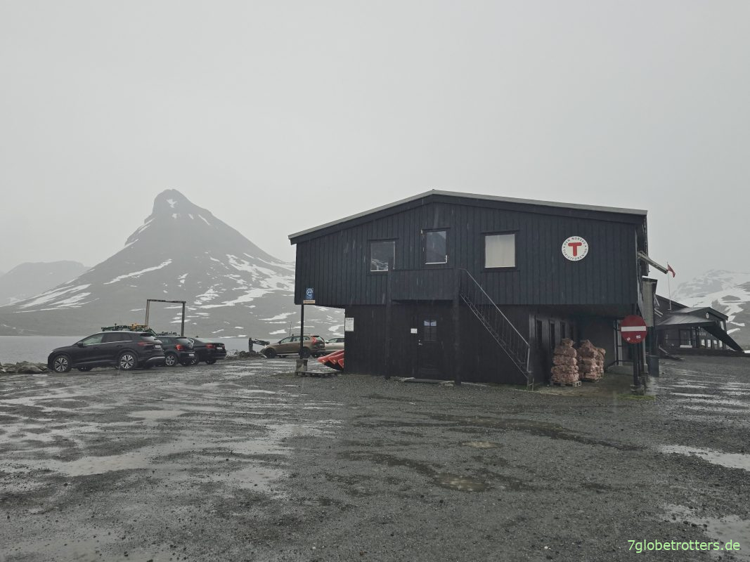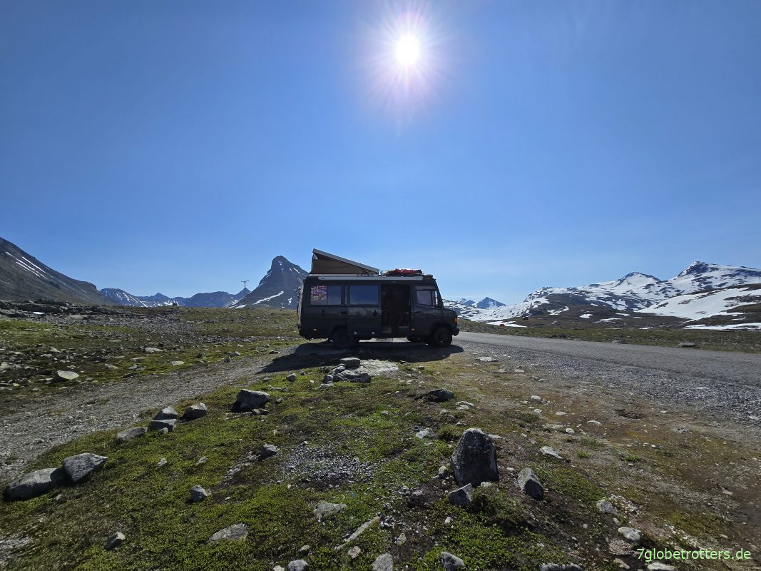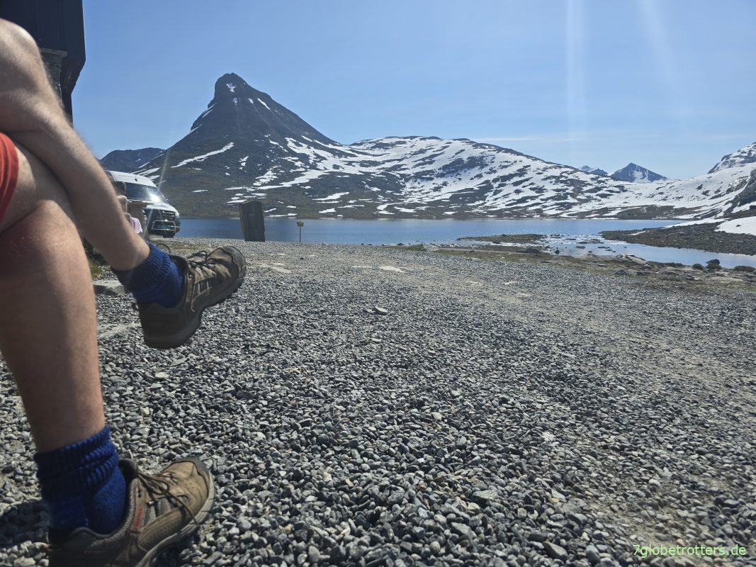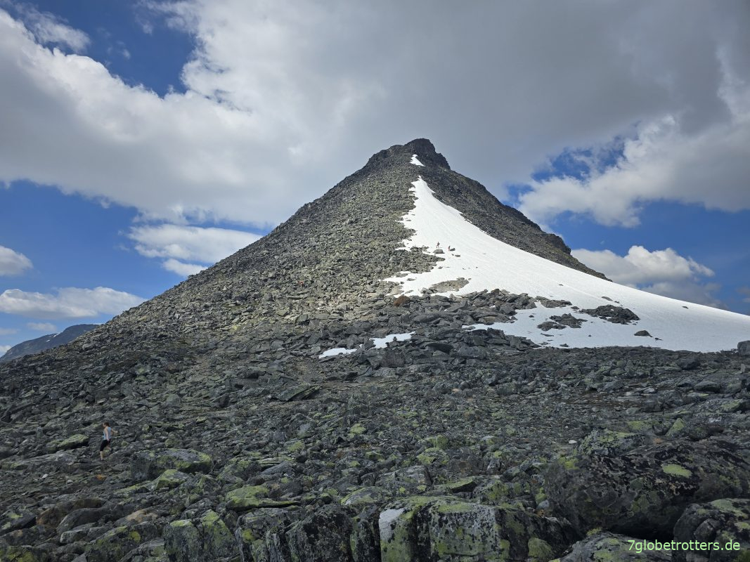 Nach der gestrigen Anstrengung auf dem Sognefjellsveien gab es heute noch nicht einmal den Plan, für die Besteigung der Kyrkja zeitig aufzustehen. Die ist ja nur 2032 m hoch und wir stehen ja schon im Basislager an der Hütte Leirvassbua bei 1400 m. Auch das Frühstück zieht sich. In der Zwischenzeit kommen heute am Sonntag viele Fahrzeuge. Die Leute strömen regelrecht hoch zur Kykja. Das verleidet mir den Aufstieg natürlich ein bisschen. Die Verzögerung kommt ja nicht von ungefähr, denn ich verhalte mich immer gern antizyklisch. Sind jedenfalls so spät fertig, dass man eigentlich fast schon wieder zu Mittag essen könnte. Aber weit ist die Kyrkja ja sowieso nicht. Lugt direkt hinterm Bus hervor.