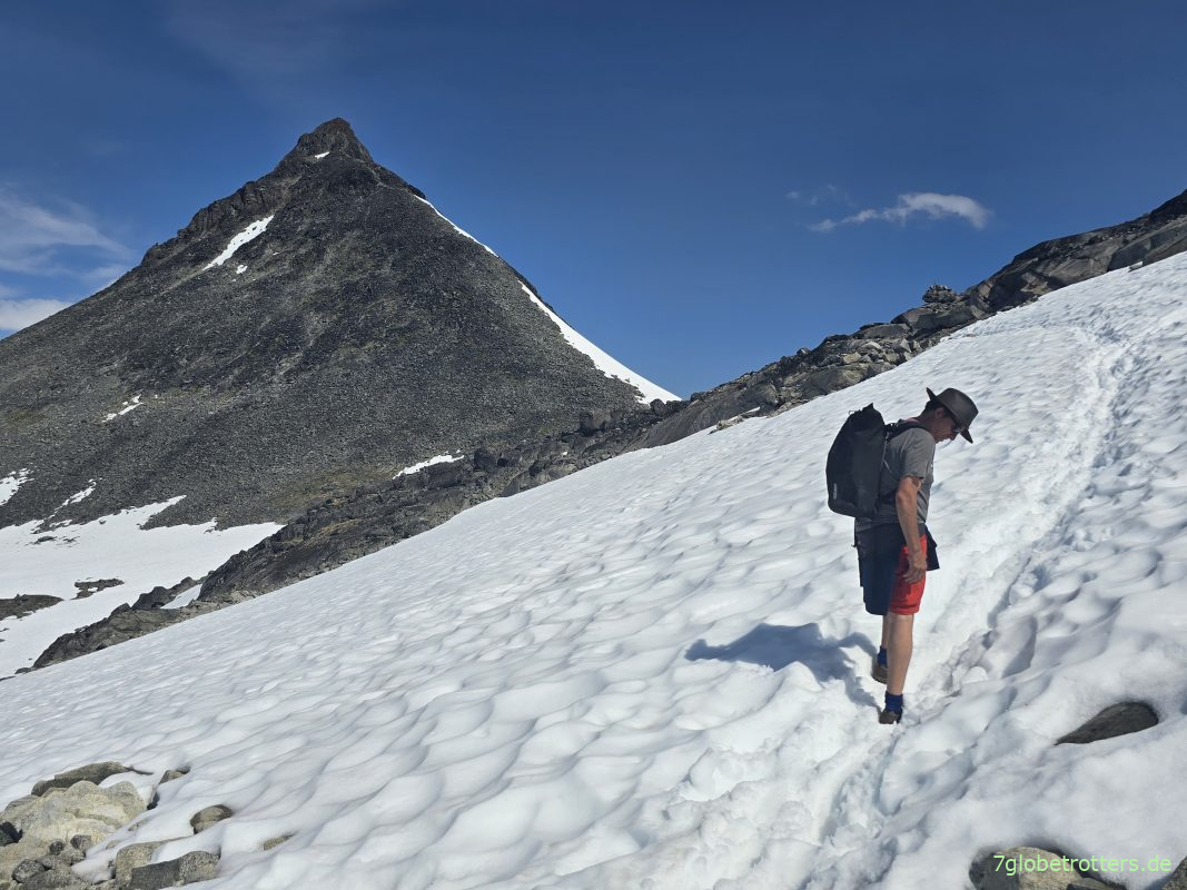 Jedenfalls ist der Aufstieg zur Kyrkja über eine Bergschulter, durch eine Senke und über ein paar Schneefelder kein großes Problem.