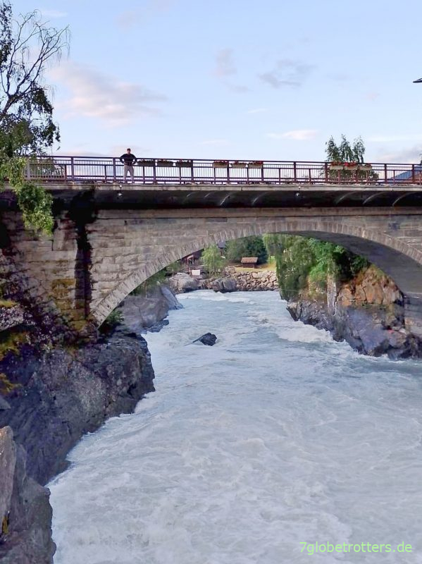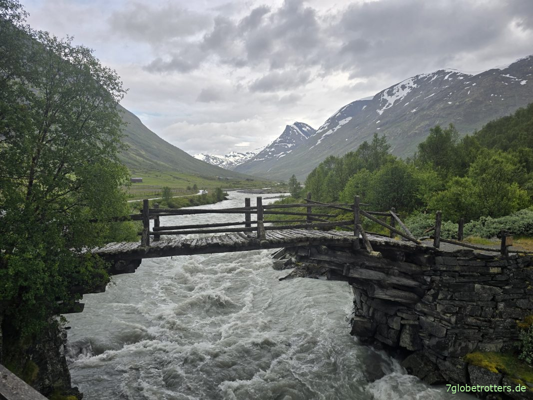 Die Bøvra, in die ja weiter oben die Leira mündet, hat auch hier an der Stabkirche Lom gehörig Hochwasser.