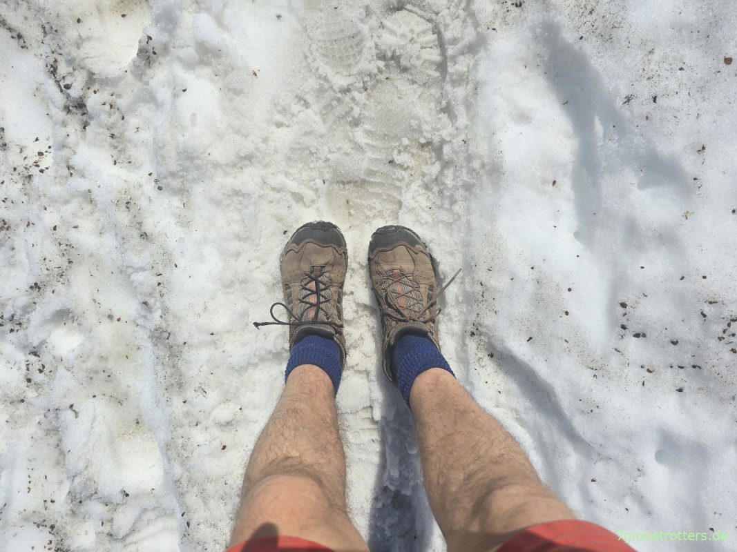 Aber auch Sneaker und Barfußschuhe sind nicht unbedingt die idealen Fußbekleidungen für Schneefelder. Da bin ich mit meinen Meindl-Schuhen und den Falke-Socken schon regelrecht expeditionsmäßig ausgerüstet. Vor allem, weil diese Wanderschuhe auf den Felsen nicht rutschen. Wenn ich die in Tunesien angehabt hätte, wäre bei meinem Sprung über den Wasserfall überhaupt nichts passiert.