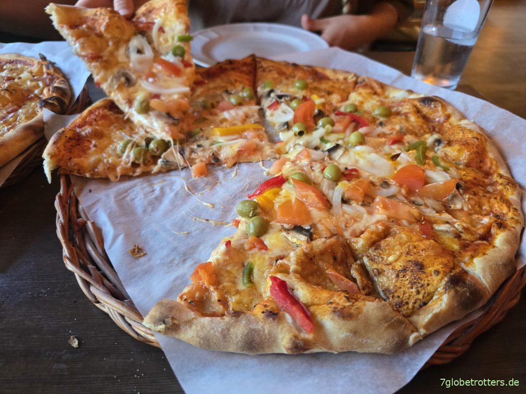 Nach dem Gewitter an der Kyrkja wird das Wetter besser und das Sättigungsgefühl geringer, so dass wir den Bus stehen lassen und zur schon entdeckten Pizzeria laufen. Eine Pizza kostet zwar 26 €, ist aber riesig und reicht für zwei. Dazu ist Leitungswasser umsonst, und so kann ich mir auch ohne eigene Bohrinsel die Verköstigung meiner Familie in einer norwegischen Kneipe leisten.