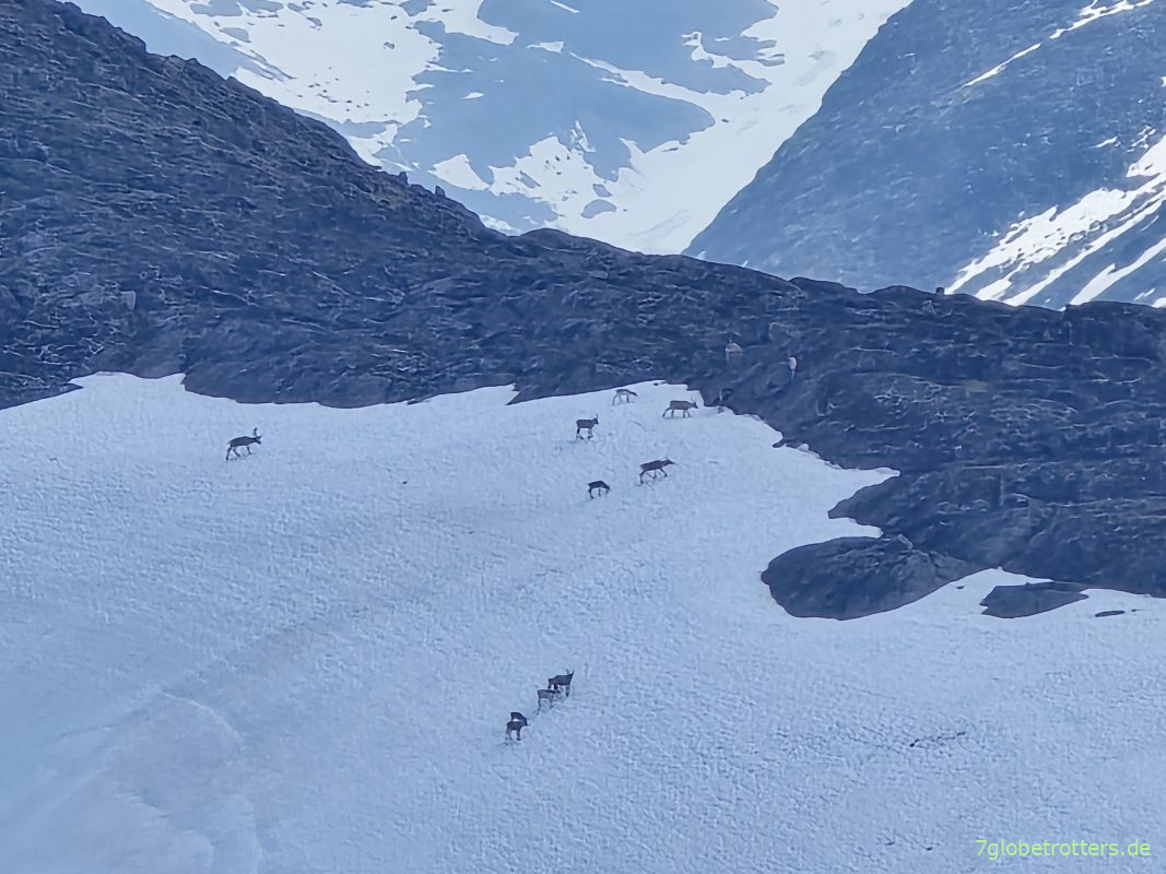 Auf den Gletschern der Umgebung sind zwei Gruppen mit Rentieren mit Geweihen zu sehen. Sowie ein seltenes Exemplar mit Hut und Handy.