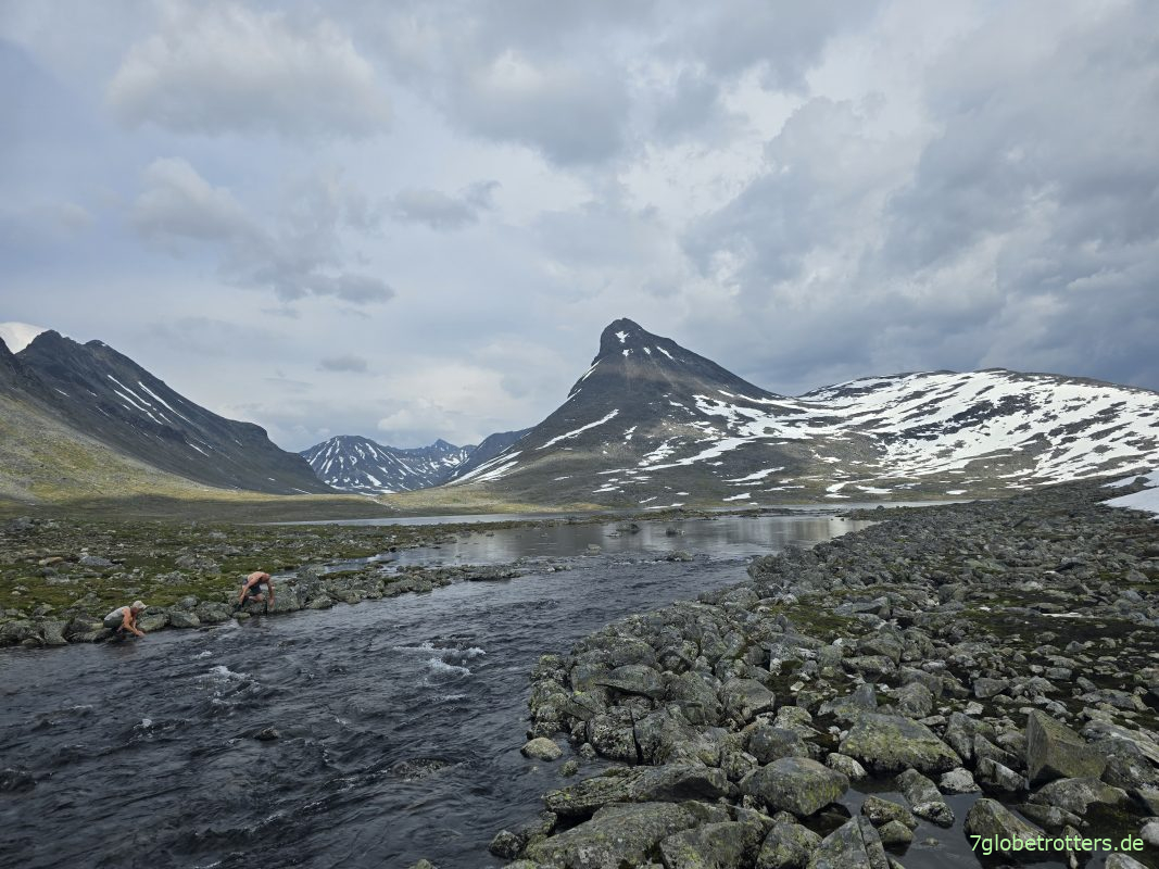 Unterwegs warne ich die Jungs schon mal vor. Aber nicht vor dem heraufziehenden Gewitter, sondern dass wir gern was zu Essen hätten. Die beiden sind in der Zwischenzeit in der Hütte, gehen aber schnell zum Bus und setzen Kartoffeln auf. Und als wir 17:45 Uhr zurück am Bus sind, wird gerade Kartoffelsalat fabriziert. Laufe schnell noch dreimal mit dem 10-Liter-Kanister zur Leirvassbua und hole Trinkwasser, bevor 19:00 Uhr ein Gewitter runterbricht, wie es im Buche steht. Regen, Blitze, Donner – alles dabei. Ja, ich weiß und hab’s verstanden: Achte im Hochgebirge auch bei schönstem Wetter immer auf ordentliche Ausrüstung!