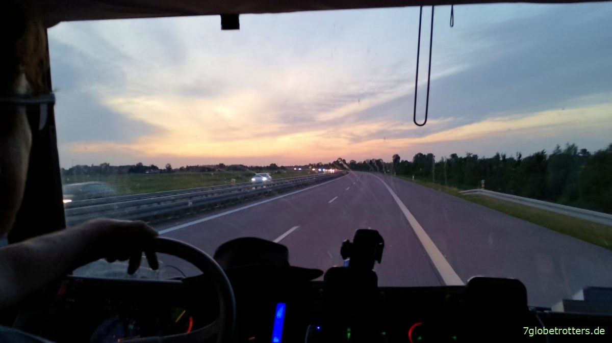 Aber wenigstens nehmen wir nicht auch noch die Ausrüstung für eine Fahrradtour mit und müssen auch nicht zurückfahren. Autobahn ist ganz nett. Mag das immer, so in den Sonnenuntergang hinein zu fahren.