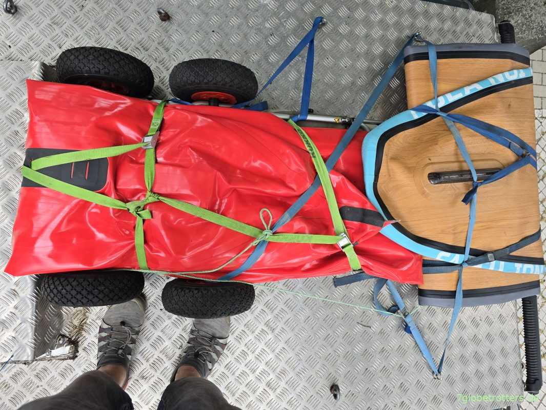 Denn wir wollen in Schweden eine Woche autark paddeln und müssen zwei Checklisten abarbeiten – die Paddelausrüstungsliste und die Wohnmobilurlaubliste. Da gibt es zwar Überschneidungen, aber die sind recht gering. Vor allem ist Paddeln eine übel großvolumige Materialschlacht. Noch dazu mit zwei Booten. Muss also die beiden Bootswagen, das Gumotex Seawave und das SUP (von der Wohnmobilliste) aufs Dach schnallen.