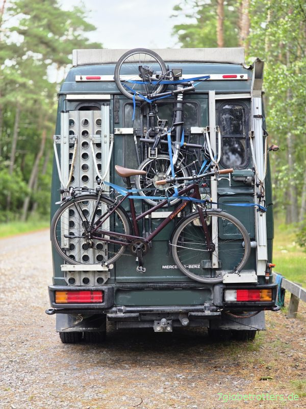 Das auch nicht gerade kleine Grabner Riverstar XXL liegt nebst 5 Kajaksitzen, Kajakpaddeln, Spritzdecken, Spritzschürzen und Rettungswesten sowie 2 Steueranlagen zwischen den Sitzbänken. Ist also insgesamt ziemlich eng. Eng geht es auch an meinem Dauerparkplatz zu, so dass ich die Fahrräder nicht bestimmungsgemäß senkrecht am Heckträger befestigen kann, sondern quer festtüdeln muss.