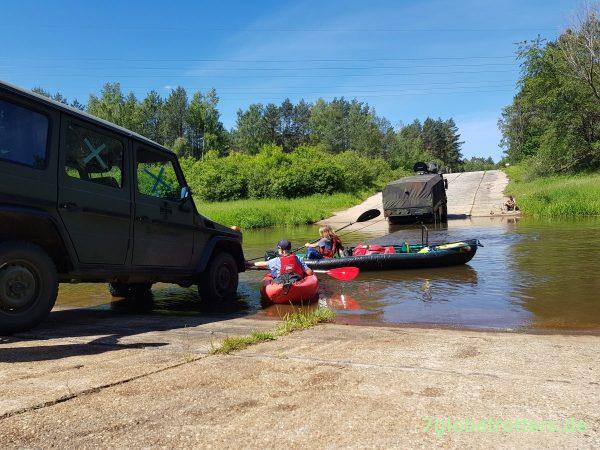 Plötzlich ein LKW im Fluss. Ein Zetros in der oberen Spree? Ist der steckengeblieben? Hä? Was machen die denn? Auf der anderen Seite ein Mercedes G. Und ein Seil quer über den Fluss. Achtung, erstmal raus! Aha, eine Wasserdurchquerungsübungsstelle.