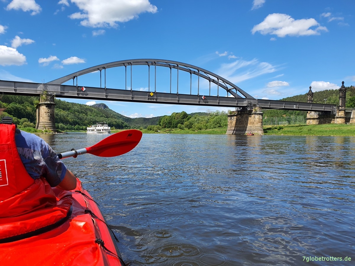 Durch den starken Gegenwind merken wir jedenfalls kaum was von der Strömung der Elbe. Vor allem nicht auf dem langen, schnurgeraden Abschnitt der Elbe von Schmilka bis nach Bad Schandau. Dafür gibt es viel zu sehen.