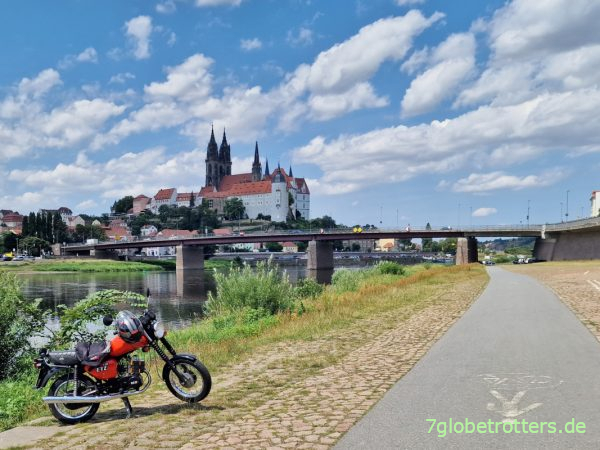 Weiter geht’s nach Meißen, dort über die Brücke und auf der anderen Seite die Elbe runter. Die Stadtverwaltung Meißen weiß natürlich, dass heute die Tour durchkommt und hat als Farbtupfer extra eine schöne 150er ETZ bereitgestellt.