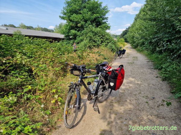 Im Biergarten merke ich angesichts zweier schöner Steckdosen, dass das passende Ladekabel für die externe Stromversorgung fehlt und ich nur die Powerbank dabei habe. Oh weh, das wird knapp. Bemerke darüber hinaus trotz der sommerlichen Temperaturen unterkühlte Knie. Bestelle mir also noch aus dem Biergarten heraus eine dreiviertellange Radhose zu unserem ersten Etappenziel.