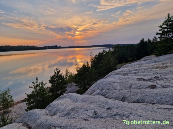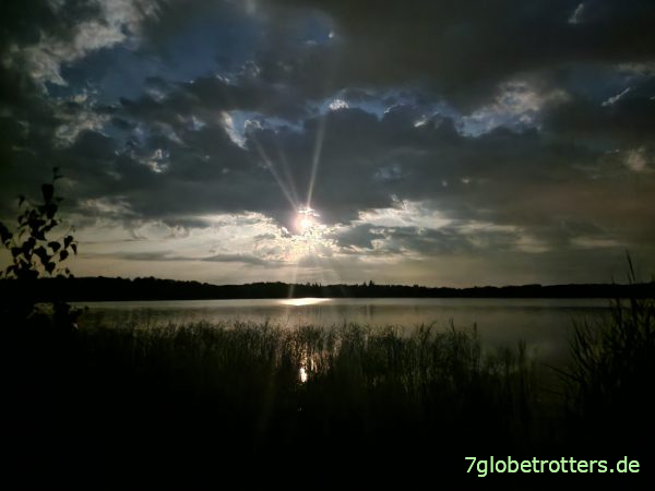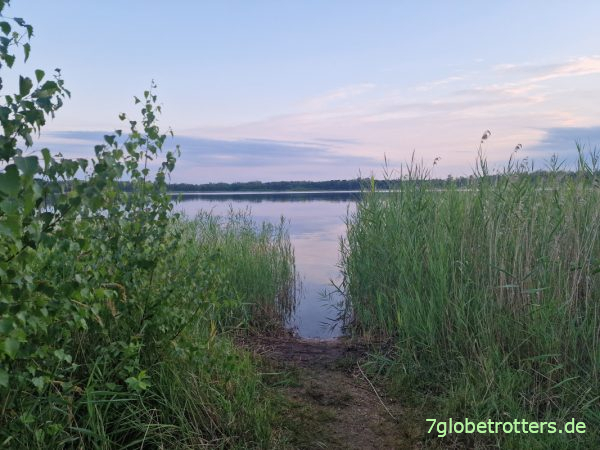 So fahren wir durch den Wald weiter nach Süden. Der Weg ist doof und schotterig, aber der Harthsee erweist sich als wunderbarer Badesee. Wir fahren fast in die letzte Ecke und finden um 20:50 Uhr eine kleine Privatbucht. Also Zelt aufbauen, baden und ab ins Bett. Die Mücken sind einfach zu fies. Irgendwas ist eben immer.