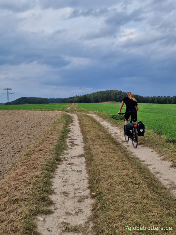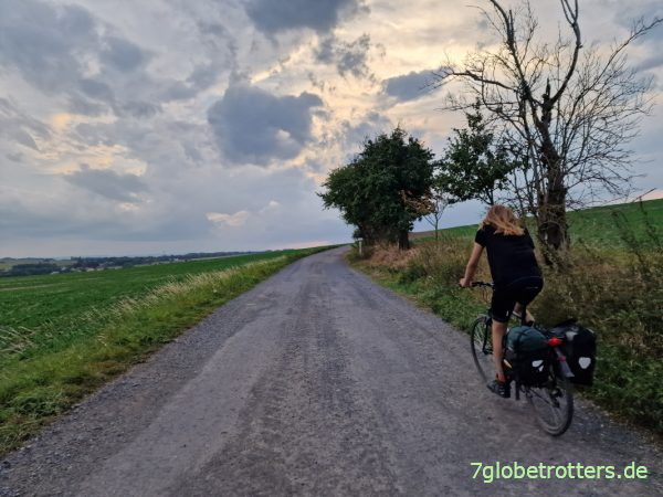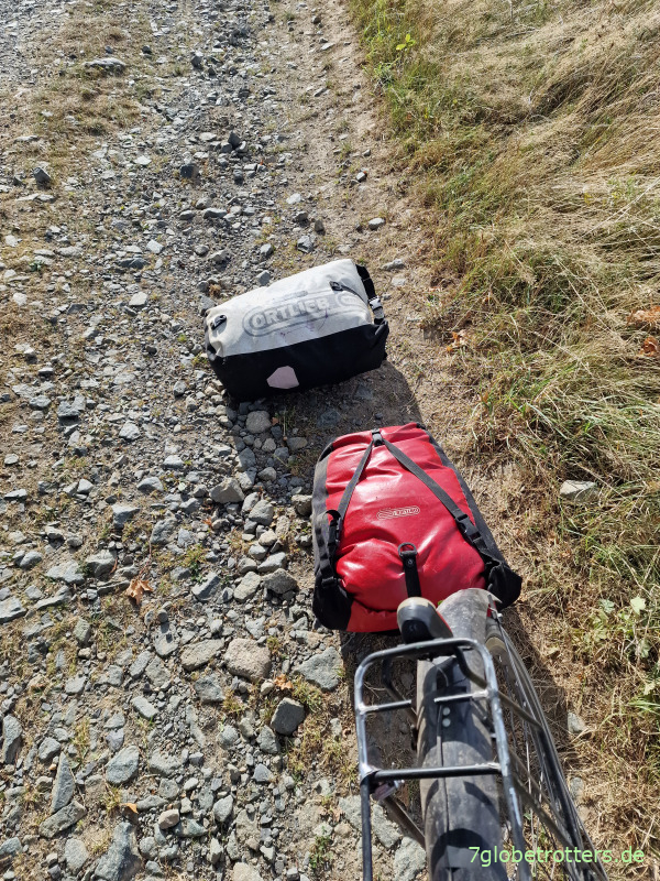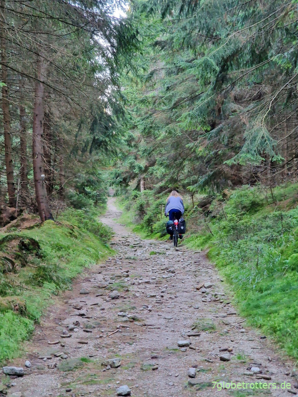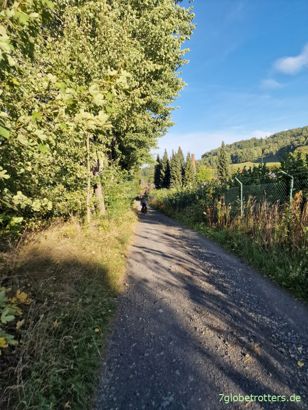 Nach 95 km geht es noch einmal hart hoch auf den 481 m hohen Špičák / Spitzberg, der nicht nur so heißt, sondern sich auch genau so fährt. Spitz hoch, spitz runter. Dazu ist die Abfahrt so schnell und holprig, dass ich meine Radtaschen verliere. Das ist die Strafe dafür, dass ich immer die untere Fixierung der Ortlieb-Taschen weglasse. Aber gut, das macht den Taschen nichts.