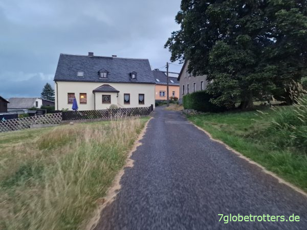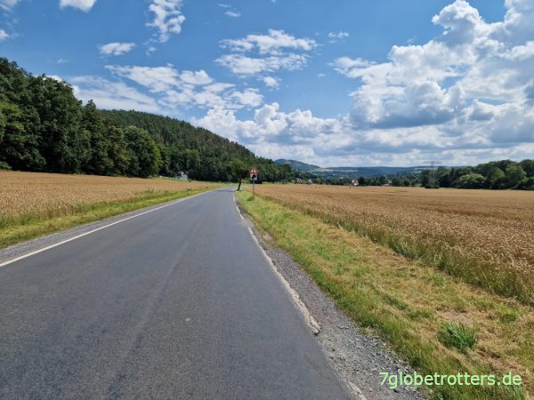 Nach Zeulenroda werden die Straßen zwar kleiner und fahrradfreundlicher, aber die vogtländischen Berge bleiben. Am schlimmsten ist der Anstieg hinter Elsterberg mit 20 %. Muss da Serpentinen fahren, um nach 105 km überhaupt hoch zu kommen.