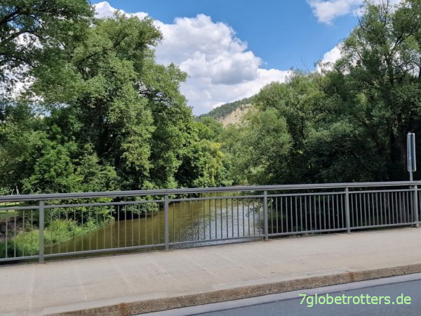 An der Saalebrücke Kahla erreichen wir mit 169 Höhenmetern den tiefsten Punkt der Radtour.
