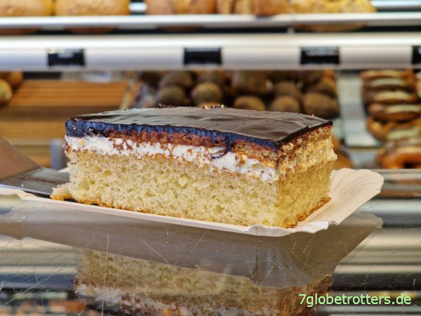 Vor dem Anstieg ins Vogtland sitzen wir in Triptis nach 73 km vor einem Supermarkt, scheckern Eis, trinken kalte Cola bzw. Limo und essen Kuchen. Weil ich mich dafür interessiere, führt mir die Bäckerin sogar LPG-Kuchen vor, der aus mit Schnaps getränkten Keksen hergestellt wird. Was es nicht alles gibt. Aber Schnaps auf der Radtour fehlte mir noch.