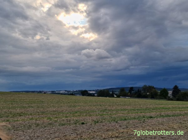 Bin bisschen besorgt, weil hier um 17:00 Uhr angeblich ein riesiges Unwetter niedergehen soll. Und es ist völlig unklar, wie weit wir auf unserer Bergtour überhaupt kommen. Aber egal, wir machen uns keine Gedanken und fahren einfach los. Die vielen Höhenmeter ins Vogtland werden wir schon irgendwie bewältigen. Und irgendwann werden wir irgendwo schon unterkommen. Haben ja unser kleines Bergzelt dabei.