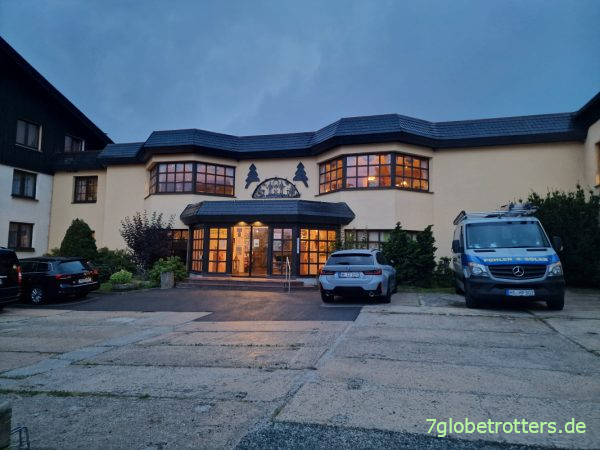 Doch zumindest geben sie uns den Tipp, noch über den Berg zum Hotel Forstmeister zu radeln und rufen dort sogar extra an, ob was frei ist. Also Regensachen drüber und weiter. Ist echt noch steil und regnet schon stärker. Hinter dem Berg (738 m) lässt der Regen jedoch wieder nach und wir finden das Hotel auf Anhieb.