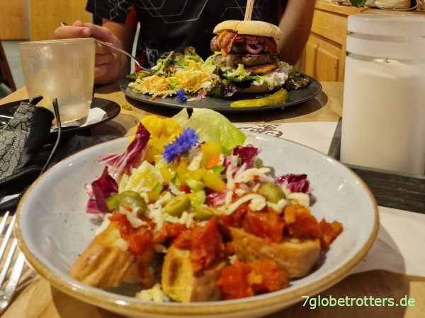 Als ich ein Zimmer für zwei hungrige Radfahrer bestelle, verweist uns der Mann an der Rezeption gleich auf den Küchenschluss, der in drei Minuten um 21:00 Uhr droht. Mein Jüngster flitzt also direkt hoch ins Restaurant und gibt völlig eigenständig die ganze Bestellung auf, während ich noch die Räder einparke, die Formalitäten erledige und das Gepäck aufs Zimmer bringe. Als ich im Restaurant aufschlage, steht das Essen schon auf dem Tisch. Genau richtig.