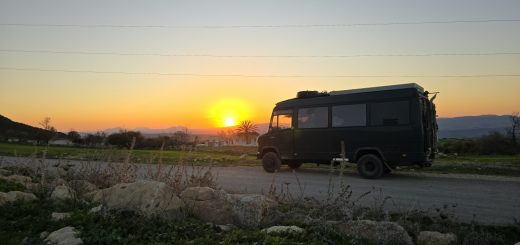 Als alle wach sind, frühstücken wir ausgiebig und starten den Bus. Ich lasse mich im ersten Gang mit Mittelgas runterrollen, damit der Motor schneller warm wird. Hab nämlich vergessen, den Motor mit der Dieselstandheizung vorzuwärmen.
