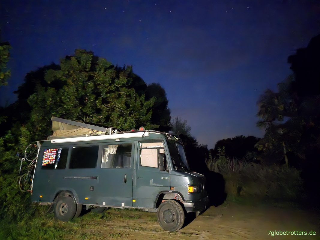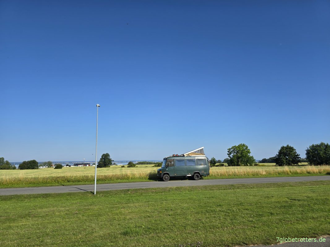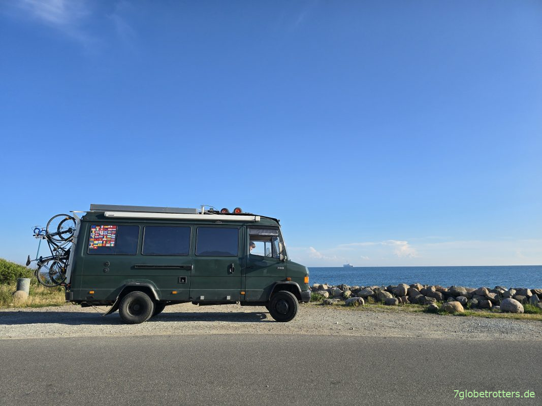 In Rostock ist es um 22:45 Uhr schon dunkel, aber wir fahren noch ein paar Kilometer bis zum nun schon fast traditionellen Stellplatz, wo wir um 23:45 Uhr alles ausklappen und in den Betten verschwinden.